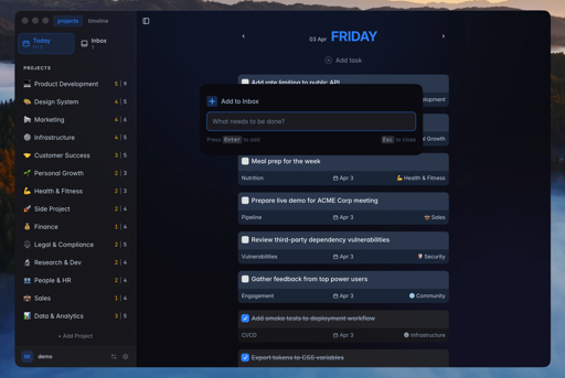 arrow-up192arrow-down1imageModern offline-first self-hosted open-source TickTick/Todoist alternative. Now with desktop app and quick add global OS popup!plus-squarelemmy.worldquolpr@lemmy.world to Selfhosted@lemmy.worldEnglish · 1 day agomessage-square17fedilink