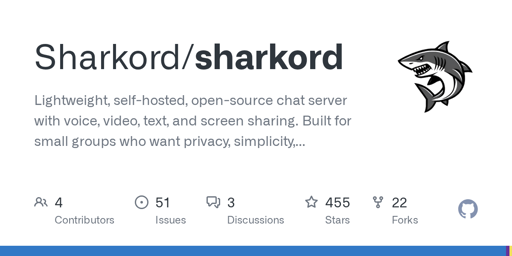 arrow-up1135arrow-down1external-linkSharkord - an open-source self-hostable Discord alternative with voice, video, and real-time messaging.plus-squaresharkord.comrecklessengagement@lemmy.world to Selfhosted@lemmy.worldEnglish · 16 hours agomessage-square69fedilink