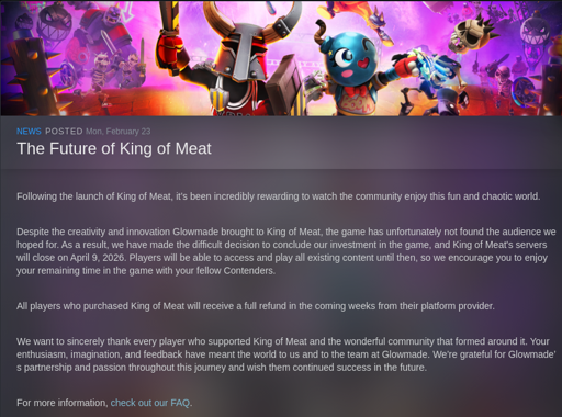 🖖USS-Ethernet@startrek.website to Gaming@beehaw.orgEnglish · 2 hours agoKing of Meat is Shutting Down (Refunds issued)startrek.websiteimagemessage-square0fedilinkarrow-up16arrow-down10