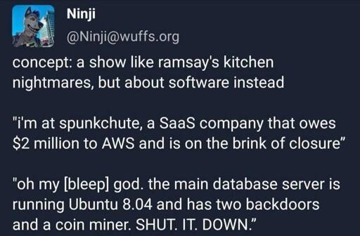 ☆ Yσɠƚԋσʂ ☆@lemmy.ml to Programmer Humor@lemmy.mlEnglish · 5 months agoRamsay's kitchen nightmares, but for software developmentlemmy.mlimagemessage-square14fedilinkarrow-up1240arrow-down11