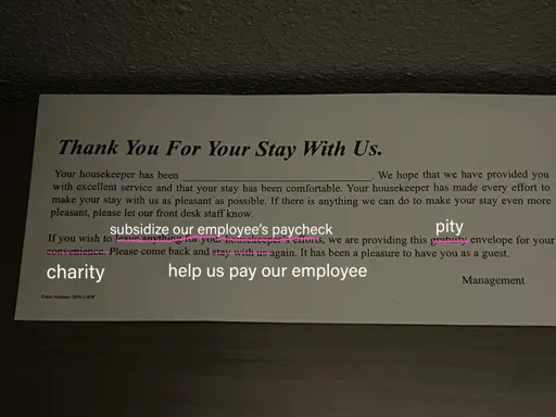 It seems to me that hotels should be more upfront about their staff being unpaid and clearly post the guidelines you’ve shared about donations from guests. Although, I suppose that if they cared about the well being of their staff, they would pay them a livable wage in the first place.