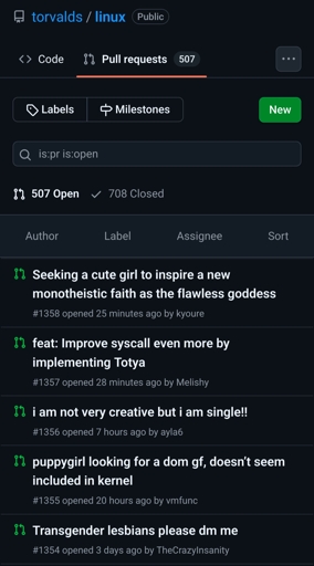 yogurtwrong@lemmy.world to Linux@lemmy.ml · 25 days agoLinux github repo is now a dating boardlemmy.mlimagemessage-square36fedilinkarrow-up1360arrow-down18