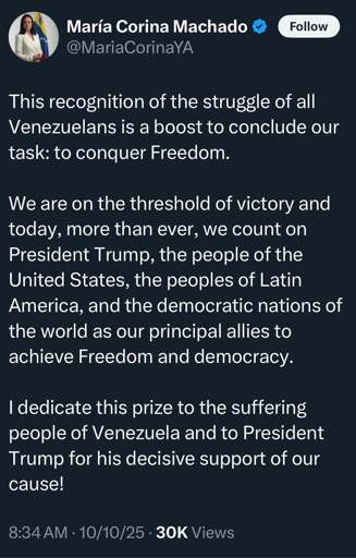 This is Sweden/Nobel committee giving Trump more than he wants. Not only do they give the prize to a Venezuelan traitor, not only legitimizing CIA destabilization, election rigging/baseless complaining about resuts, and future war, the only media focus is going to be on what traitorous/TDS scum Sweden/Nobel committee are vs how much dopamine hit should you enjoy that Trump is throwing a tantrum. Justifying war on Venezuela is just a massive demonic gift to Trump, and not calling out Sweden/Nobel committee for fascit evil is just perfect for fascism.