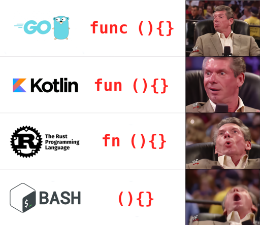Yeah, it’s a joke, but I disagree on the void, the other languages on the meme doesn’t need a return type (when they are returning nothing), java needs it.