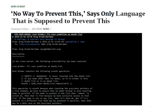 It’s not even about the size or complexity of the project - the code in question is wrapped in an unsafe{} block, so no one should be expecting it to have the guarantees you’d normally get from rust. It’s ragebait.