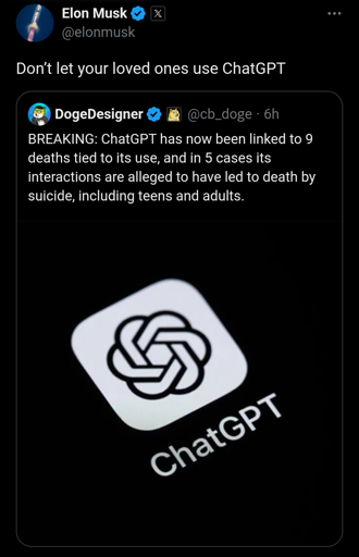 Surprised grok hasn’t been tied to any deaths yet. I guess that’s one good thing about attaching it to a social media, someone can see your chat and tell you that drinking Clorox isn’t going to teleport you to an alien paradise.