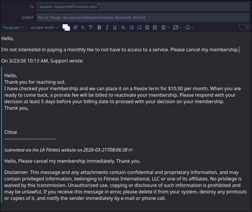 My wife goes to a la fitness (it’s super close and has a kids club) and has had to stop going for months at a time for various reasons. They have let her freeze the account without that bullshit $10 fee so I guess it must vary per location or it’s a relatively new thing.