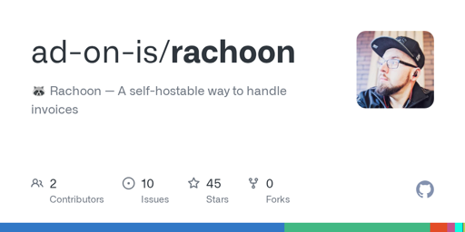 arrow-up1165arrow-down1external-linkRachoon - Self-Hostable Invoicing made simpleplus-squaregithub.comad_on_is@lemmy.dbzer0.com to Selfhosted@lemmy.worldEnglish · 2 months agomessage-square8fedilink